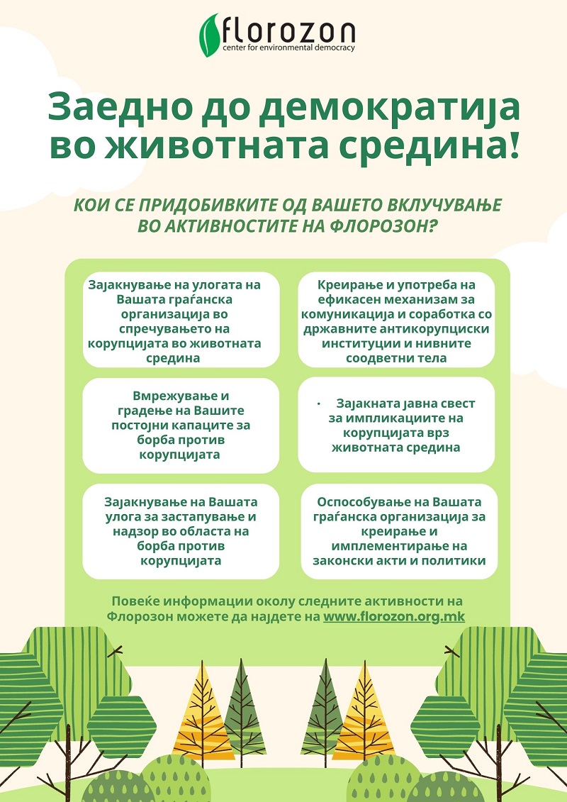 На основа на претходно воспоставената соработка, со задоволство Ве покануваме да бидете дел од проектните активности на Флорозон, во областа на борбата против корупцијата и воспоставување на демократија во животната средина.